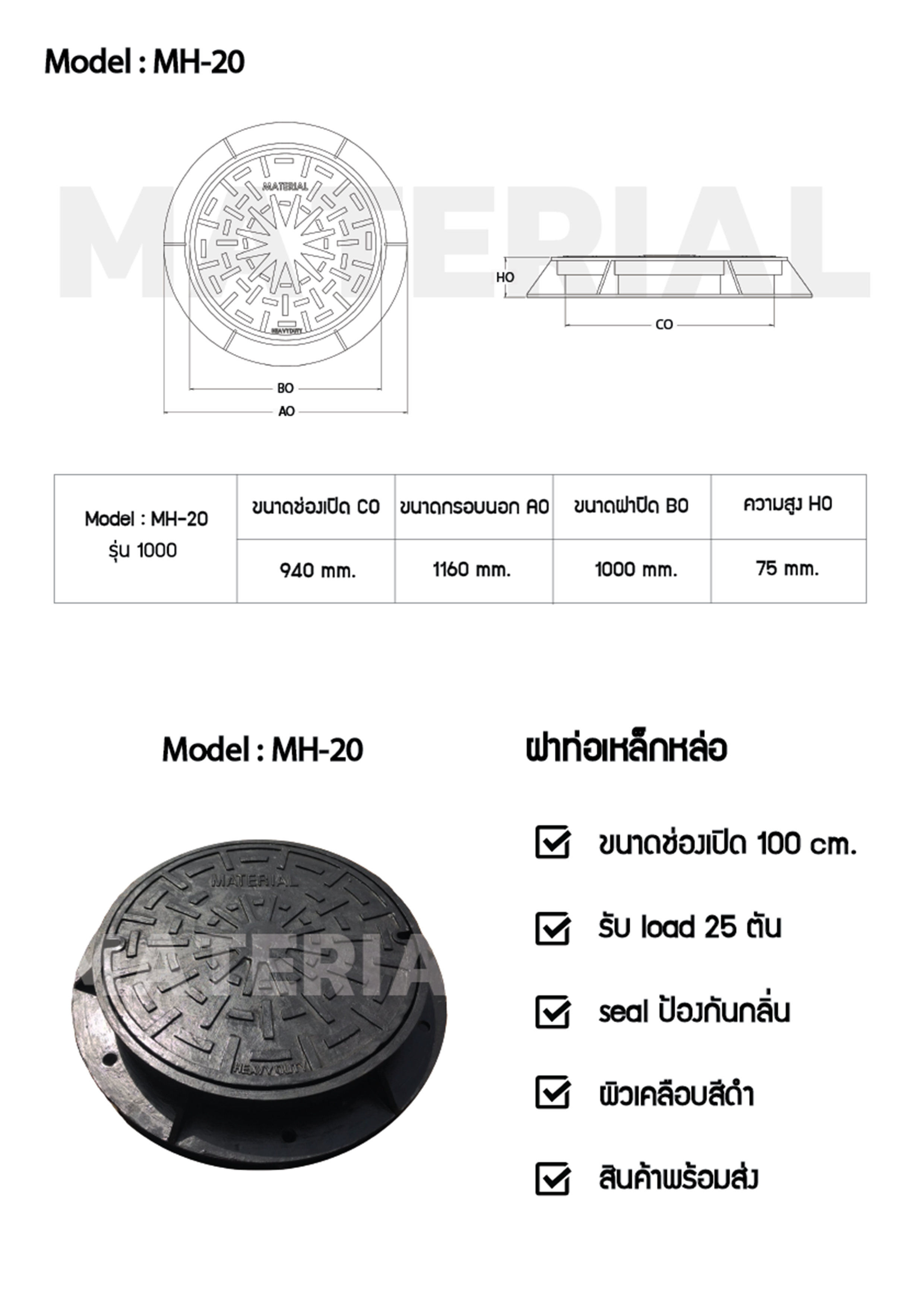 | ฝาท่อเหล็กหล่อ MH-20 | 100 | 25 | กลม | ผิวเคลือบสีดำ | สินค้าพร้อมส่ง |