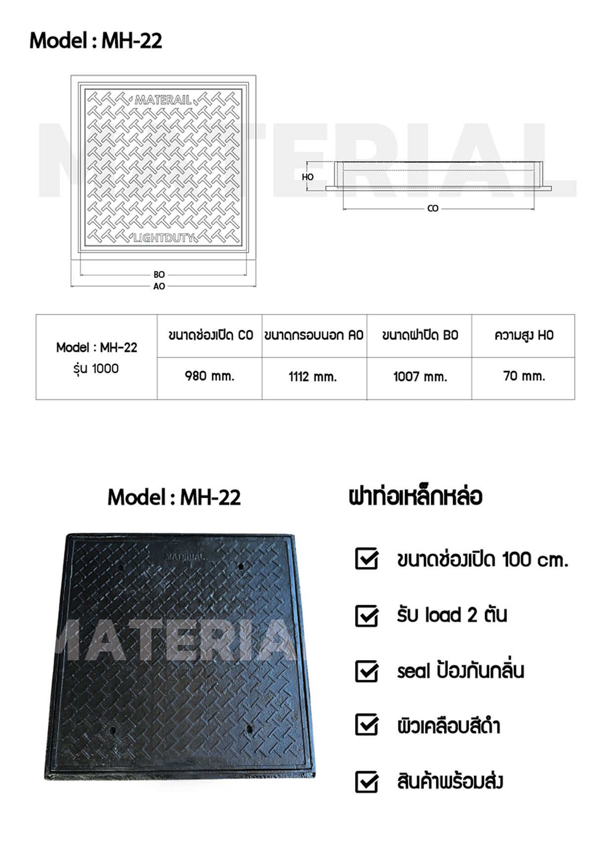 | ฝาท่อเหล็กหล่อ MH-22 | 100 | 2 | สี่เหลี่ยม | ผิวเคลือบสีดำ | สินค้าพร้อมส่ง |