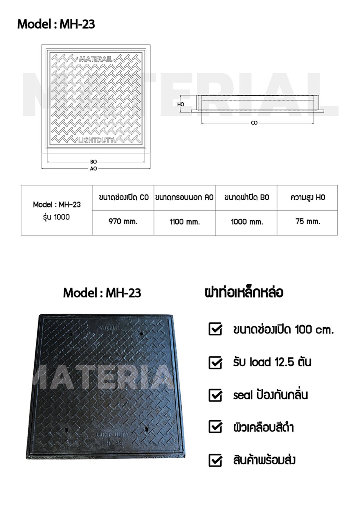 | ฝาท่อเหล็กหล่อ MH-23 | 100 | 12.5 | สี่เหลี่ยม | ผิวเคลือบสีดำ | สินค้าพร้อมส่ง |