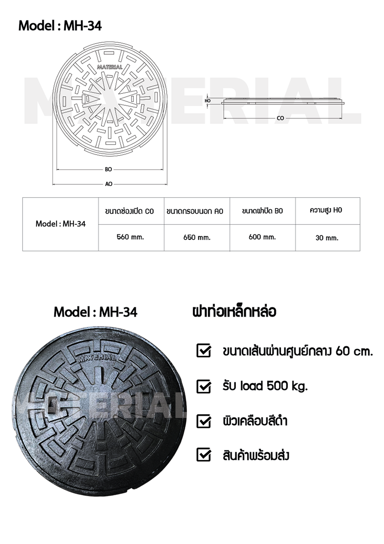 | ฝาท่อเหล็กหล่อ MH-34 | 60 | 2 | กลม | ผิวเคลือบสีดำ | สินค้าพร้อมส่ง |